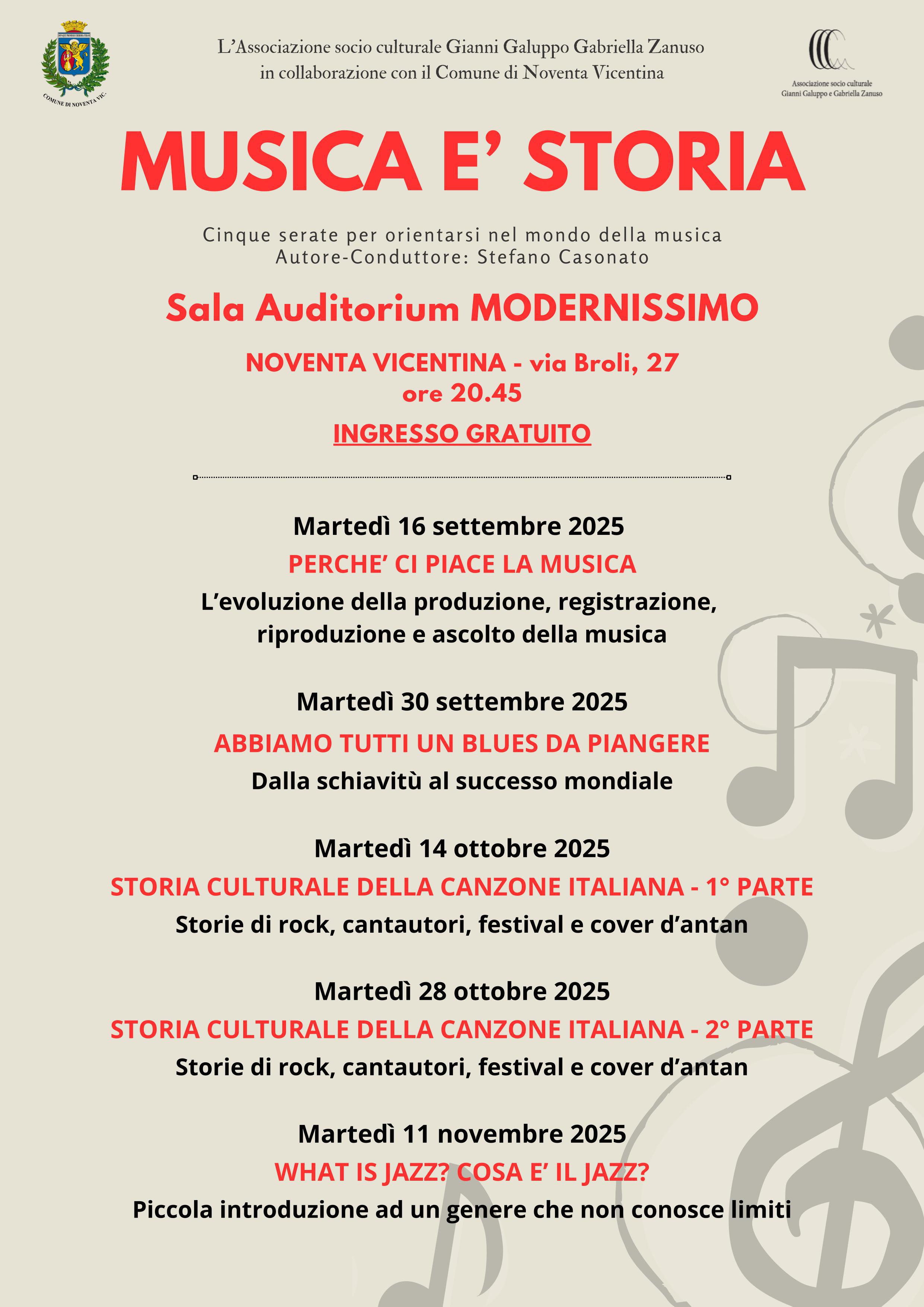 La terza di cinque serate dedicate alla musica ed alla sua storia, intitolata “Storia culturale della musica italiana- prima parte: storie di rock, cantautori, festival e cover d'antan”. Guida in questo viaggio nella storia della musica sarà l’esperto e cultore dell' arte musicale Stefano Casonato. L'evento è organizzato dall'Associazione socio culturale Gianni Galuppo e Gabriella Zanuso in collaborazione con il Comune di Noventa Vicentina.