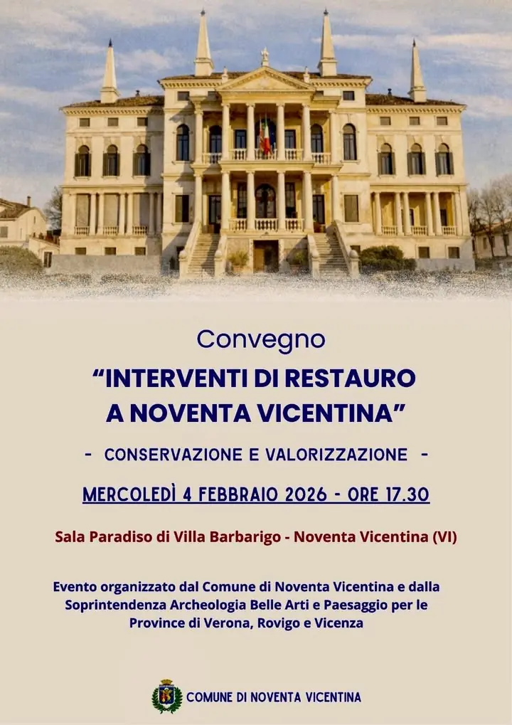 🏛 INTERVENTI DI RESTAURO A NOVENTA VICENTINA Conservazione e valorizzazione Un incontro pubblico per raccontare il grande lavoro di tutela e valorizzazione del patrimonio storico-artistico di Noventa Vicentina. 📅 Mercoledì 4 febbraio 🕠 Ore 17.30 📍 Sala consiliare – Villa Barbarigo Rezzonico (spazio
